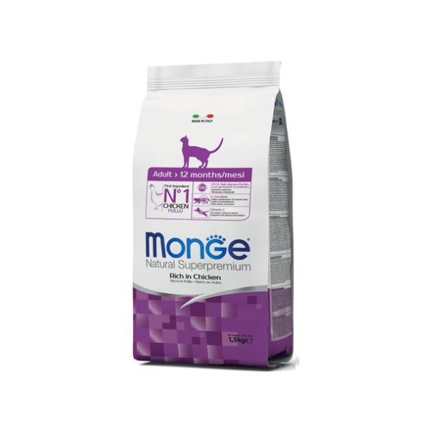 מזון יבש פרימיום לחתולים בוגרים מבית MONGE, בטעם עוף עשיר וטעים. מכיל רכיבים טבעיים ואיכותיים המספקים לחתולך תזונה מאוזנת ובריאה מדי יום
